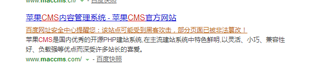 目前maccms官方被百度网址安全中心提醒您:该站点可能受到黑客攻击,部分页面已被非法篡改! 苹果官方网站因为特殊原因已经停止访问,该内容被禁止访问,但是升级补丁更新的网址还是可以打开的。 截图如下: