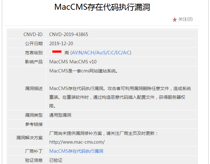 苹果CMS漏洞详情: 苹果CMS V8 V10版本存在代码重装漏洞,以及代码后门漏洞,任意文件删除漏洞,通过CNVD-2019-43865的信息安全漏洞通报,可以确认maccms V10存在漏洞,可以伪造恶意代码发送到网站后端进行执行,可以删除网站目录下的任意文件,可删除重装苹果CMS系统的配置文件,导致可以重新安装maccms系统,并在安装过程中插入sql注入代码到数据库中去执行并获取webshell以及服务器权限。