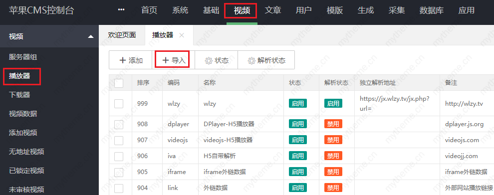 3,导入播放器文件步骤:来到系统后台:>>视频>>播放器>>导入(把我们刚才下载的2个文件直接导入即可,需要一个一个导入)