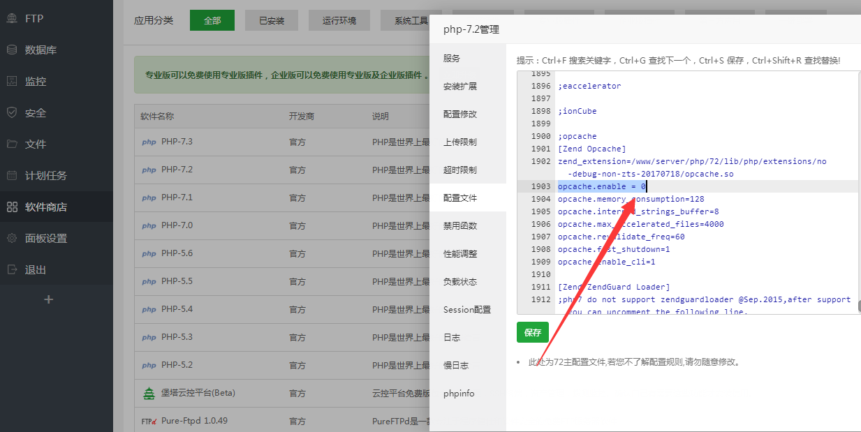 解决办法: 登录自己的宝塔面板 选择‘软件商店’,再选择自己所用的php版本的设置、再点击配置文件。 搜索opcache.enable = 0,将0改为1保存,再重启php(一定要重启) 重启完后再去你的苹果cms后台设置试试就可以了! 这里说一下有的php配置文件默认是1的,那就改成0.
