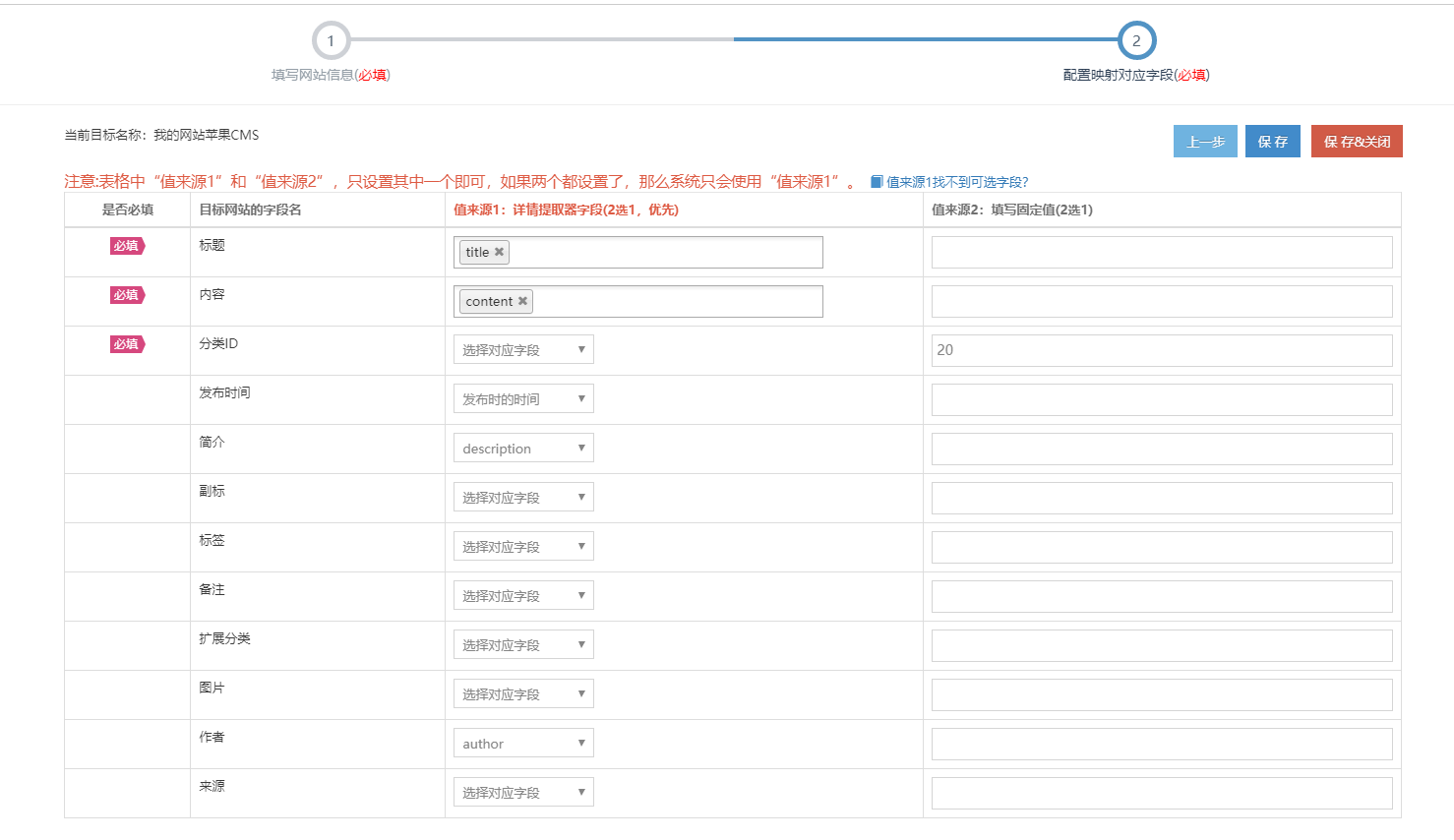 2. 发布到苹果cms,怎样填写发布目标的对应字段? ‘目标网站的字段名’ 一列是对应苹果cm系统端的属性; ‘值来源1’ 一列是选择采集字段和一些其他特殊参数(例:抓取URL,抓取时间,随机数字等); 注意:可选择的采集字段,是映射创建该发布目标的任务详情提取器中设置的采集字段名称; ‘值来源2’ 一列一般是填写固定值; 注意:‘来源值1’ 优先生效,如果 ‘来源值1’ 选择了对应的某个值,那么 ‘值来源2’ 则不会生效;