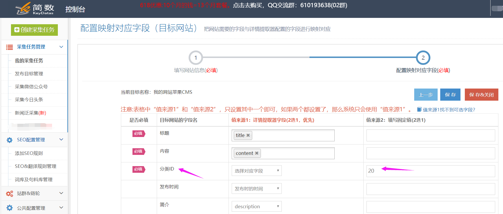 下面重要字段详解: 标题(必填):一般对应采集字段title,在 ‘来源值1’ 中选择即可;(可多选组合字段);内容(必填):为正文部分,一般对应采集字段content, 在 ‘来源值1’ 中选择即可;(可多选组合字段); 分类ID:发布数据的所属分类,值是苹果cms的分类数字ID,不支持多分类发布; 常在 ‘来源值2’ 中填写固定值,也可在 ‘值来源1’ 选择采集字段(详情可看数据发布-设置分类(栏目)技巧); 发布时间:设置文章的发布时间,默认发布时的时间(相当于实时,什么时候发布,就显示什么时间)。 标签:设置发布数据的标签,值可以是苹果cms中已存在的标签,不存在的会自动创建。