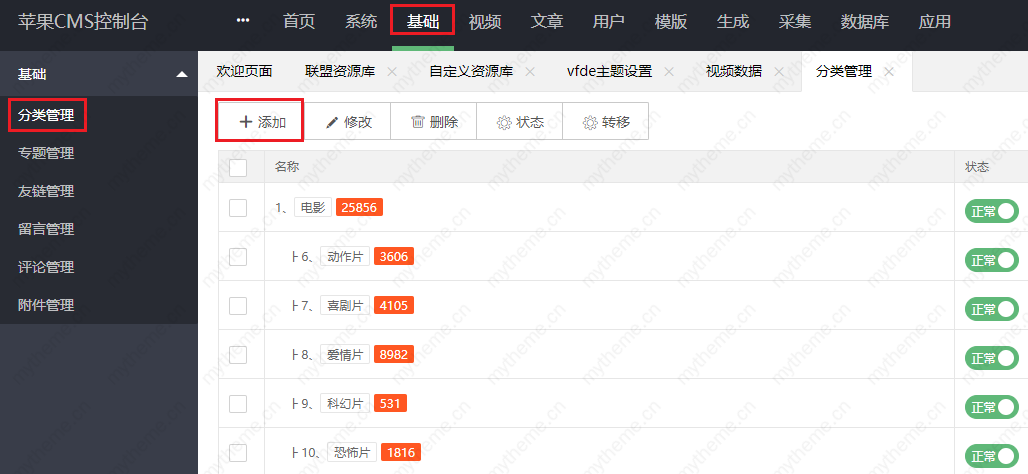 苹果cms在采集明星资源进行绑定分类时发现没有可以绑定的分类,这是因为苹果cms系统默认没有明星这个分类栏目。所以需要我们手动添加一个“明星”的分类,然而明星又分什么大陆明星和港台明星等等。因此我们还需要添加明星下面的“大陆”明星“港台”明星等子分类。下面我们就开始添加明星分类和子分类的教程。 一,明星分类的添加 1.首先进入后台 ,按顺序依次点击 基础>>>分类管理>>>添加