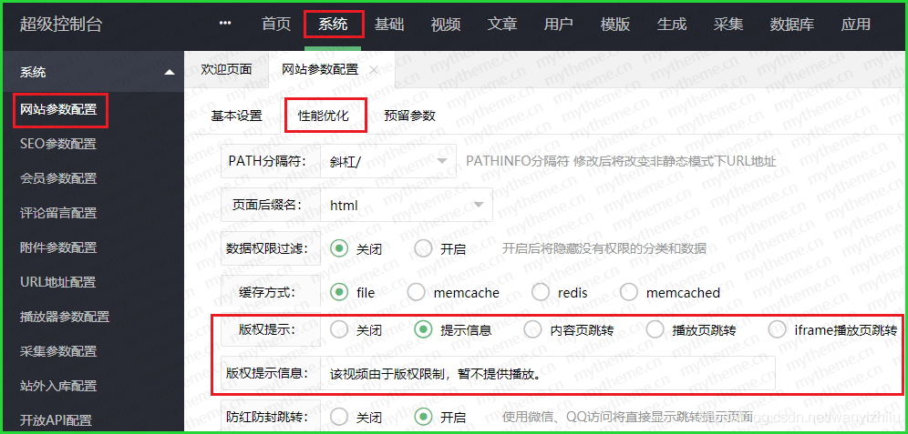 2,首先打开cms后台进入【系统】-【网站参数配置】-【性能优化】版权提示那里选中【提示信息】。【版权提示信息】:可以自定义修改要显示的提示文字。如果选中页面跳转会在打开对应页面时直接跳转至提醒页面,其他选项自行测试,现在只讲一下提示信息的设置。