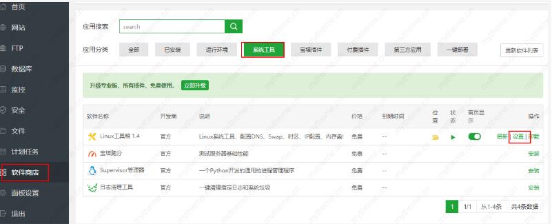 【4】小于1G以下内存的服务器可以使用“swap/虚拟内存”方法安装fileinfo扩展 swap是Linux下的虚拟内存,设置适当的swap可增加服务器稳定性 建议swap容量在真实内存容量的1.5倍左右,若您的服务器内存大于4GB,可设1-2GB的固定值 swap文件默认保存在/www/swap,设置前请确保磁盘空间够用 若您不需要swap,请将容量设为0 OVZ虚拟架构机器不可用此功能 宝塔面板操作步骤如下:软件商店----系统工具---linux工具箱设置