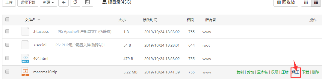 解压上传的CMS程序,(maccms10.zip)。