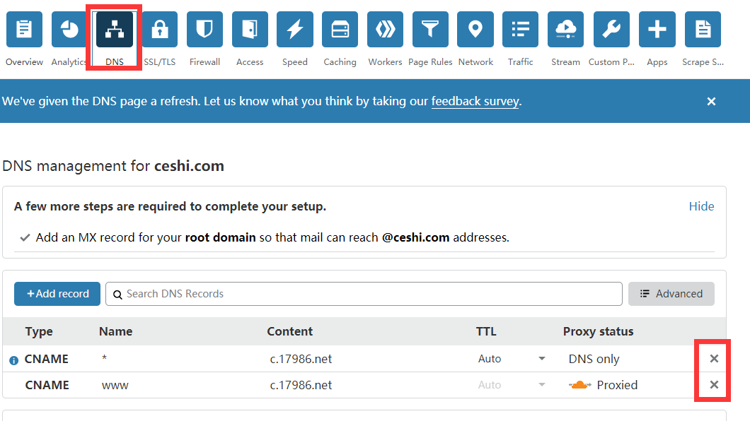 点击DNS进入解析,先删除原来不是你的解析。