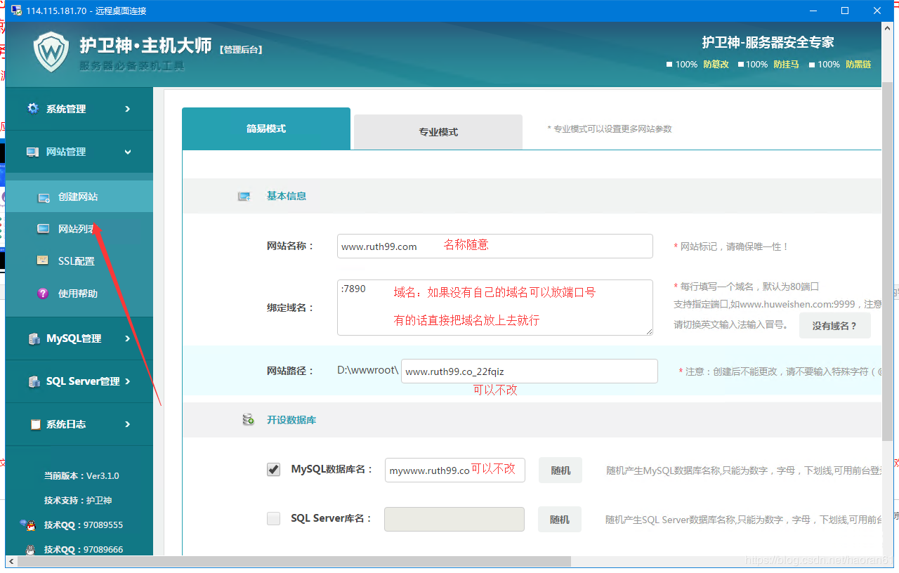 1 小时前 上传 第八步:服务器地址127.0.0.1即可,端口3306,数据库的账号密码在安装护卫神的时候自己设置的,填进去就行,其他就后台账号密码填写一下,记得下一步之前先测试一下数据库的连接。 第九步:这时已经安装成功! 它会自动跳转到后台。