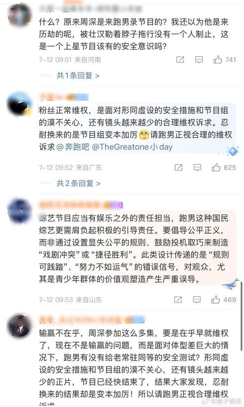 《奔跑吧》这档节目最近**沸沸扬扬。收视率是不错,0.87%的成绩摆在那儿,可问题是,拿下收视冠军,也招来了不少骂声。大家伙儿最不爽的,是最新那一期里撕名牌那摊子事儿。话说周深在那儿,瘦是瘦,但真挺不住。李晨和郭艾伦两个大块头,在那儿把他拖来拖去的。郭艾伦那身高,一米九不止,直接就把周深拎起来,转着圈圈玩。周深躺在地上死死护着那块牌子,郭艾伦还不依不饶,抓住他衣服,拖了足足十一秒。这操作,看着都替他捏把汗。周深被拖得惨,鞋都甩脱了,脸上也磕破了。旁边那帮人看见这景象,想上手拉他,周深摆摆手,说啥也不让动,他心里惦记的是那个麦克风,怕被人家给抢了去。这当口,有人发现周深耳朵都紫了,这哪是玩儿,是在玩命。可节目组呢?到*没个说法。评论区都给导演姚译添给关了,大家伙儿只能在别的地儿骂。有人说了,明星上节目磕磕碰碰是常事儿,想当年Baby在跑男里也受过不少伤。这话不假,翻出Baby以前的老视频,脸上挂彩、手指头断、头发被扯得乱七八糟的镜头,不少。可问题是,大家伙儿好像就没这么上纲上线。可***人觉得,时代不同了。大家看节目,不光图个乐呵,更在乎人能不能安全回来。这不是打架,是游戏,规矩得讲,安全得保。这一回,节目组也确实做得不地道。拖拽旁边的人谁*没吱声,摄像师就那么看着拍,*没上去拦一拦。周深被拖完,脚底板都磨黑了,麦克风*没了,那样子,看着是真叫人心里不得劲儿。其实不光是周深,以前跑男里头,受伤的成员也不少,公开的医疗记录都摞那儿好几十条呢。可大家伙儿好像就没这么多意见,是大家对人身安全这块儿看得更重了。要说别的节目,像韩国那边的综艺,拍对抗游戏都得提前把章程定得明明白白。美国那边搞真人秀,连肢体接触时间都给规定了,不能超过五秒。在网上吵得热闹,有人觉得这就是追求真实效果,必须得担点风险;也有人说,明星拿高薪,就该受得了这份罪。可***人想说的是,不管你收视率多高,安全这根弦儿不能松。节目组这回,显然是考虑不周。是该提前把安全预案做得更充分点,还是让嘉宾自己掂量着担风险?暴露出综艺这行当里头,规则得琢磨琢磨。大家看节目,不光要看着过瘾,更要看着舒心,安全要是出了岔子,那赔了夫人又折兵。