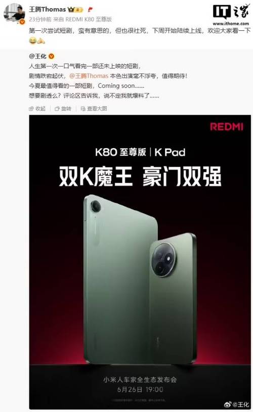 REDMI出的那部短剧《时空合伙人》,定在7月17号开播了。这部剧挺,号称是“2025年最狠的穿越创业剧”,就挺带劲。官方发的海报里,能看出是抖音、REDMI和万合天宜一起搞的。REDMI K80至尊版手机和K Pad平板在剧里也有戏份。这手机和平板,看着还挺拉风的。陈冠宁和舒童是这剧的主演。除了他们俩,还有几个挺人也在剧里。**小米中国区市场部老大王腾,还有REDMI的产品经理胡馨心。他们俩平时管着小米和REDMI,居然在剧里演起戏来了,这也挺有意思的。小米公关老大王化还专门预热了这部剧。他说他这辈子第一次能一口气看完一部还没上映的短剧,这剧情,哇,跌宕起伏的。王腾演的那个角色,很真实,一点不装。他觉得这是今年夏天最值得看的一部剧。《时空合伙人》讲的就是穿越和创业。**钻进一个想象力爆棚的世界,看看在不空里创业是啥样。这题材挺新奇的,所以多数人等着看呢。剧里,陈冠宁和舒童会带着观众穿越,经历创业的各种难事儿和好玩儿的事儿。他们得碰各种钉子,也得不断想办法搞出新花样。观众能看到他们在不空里怎么变。王腾在剧里演得怎么样,也挺期待的。他平时管着市场和品牌,经验足。他演的角色,肯定更有嚼头。观众能看到一个更立体的创业者形象。剧中那个REDMI K80至尊版手机和K Pad平板,也非常重要的。这些玩意儿性能好,用着也方便,帮主角们创业能加分不少。观众能看到这些手机和平板在实际用起来怎么样,**它们**的方便和高效。这剧是抖音、REDMI和万合天宜一起做的。抖音看剧方便,REDMI品牌响亮,万合天宜会搞新花样,这三家合作,观众肯定能享受到更好的剧。抖音平台让看剧更方便,REDMI品牌让剧情和表演更靠谱,万合天宜的创新能力让剧情更带劲。7月17号开播的《时空合伙人》,能给观众**一场穿越时空的创业体验。这剧因为题材和剧情都挺很,肯定能**不少观众。陈冠宁、舒童、王腾这些主演,表演肯定不会差。剧中那些REDMI K80至尊版手机和K Pad平板,也能****到科技**的方便。这剧一出来,不光**看了过瘾,也给REDMI品牌**了更多**和好名声。相信《时空合伙人》能成今年夏天最受欢迎的短剧之一,给观众**一场难忘的穿越创业之旅。