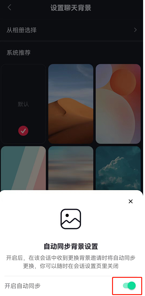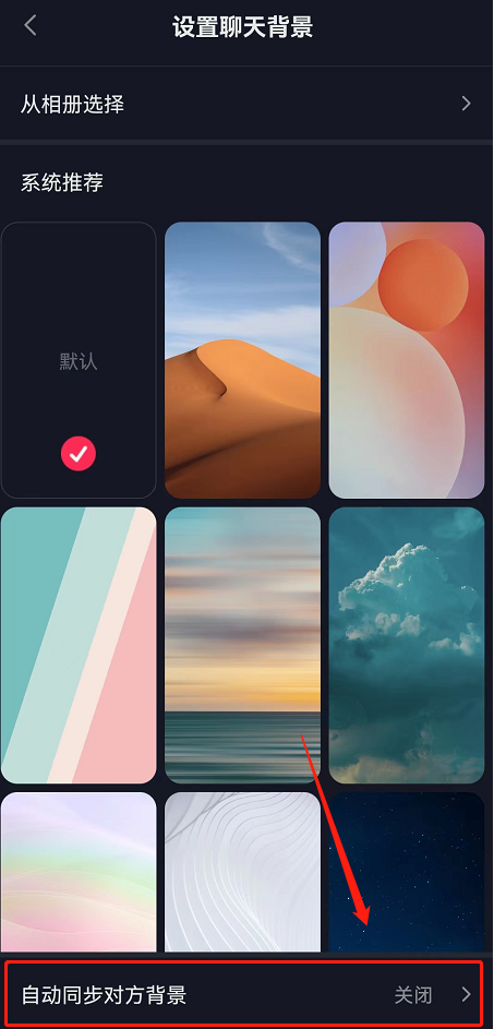 4、接着在聊天背景页面最下方大家可以看到自动同步对方背景功能。
