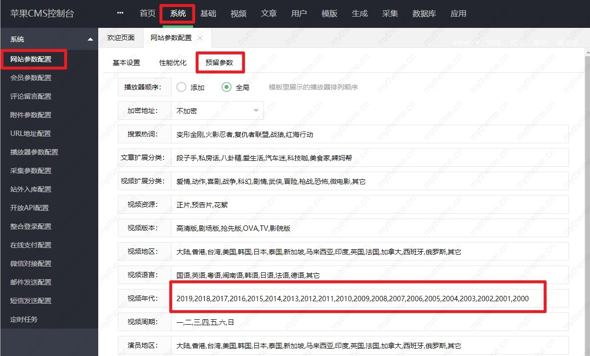 问:苹果CMS10 视频分类年代只有2010-2018怎么添加2019,2020年份筛选 答:修改添加苹果CMSv10年代,要分三步来操作 第一步:苹果CMS V10管理后台>>系统>>>网站参数设置>>>预留参数>>>视频年代>>> “2019,”逗号隔开(就是在2018,前面加上【2019,2020】保存即可。)