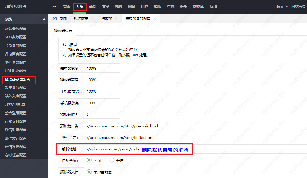 2,首先看看你采集的是什么类型的播放地址;如果是腾讯、优酷、爱奇艺等播放地址,这种地址需要解析接口支持解析才能播放了。 如果不能播放,说明解析接口不支持解析;如果你有其他能解析的播放的接口,就自己换上能播放的解析接口就好了 再者检查采集数据的播放地址,如果是完成的http地址,则需要开启播放器的解析状态用解析播放;如果采集的数据ID可以直接用本地播放器来进行播放。最后要删除系统默认自带的解析接口,默认解析接口已经失效。删除步骤如下图