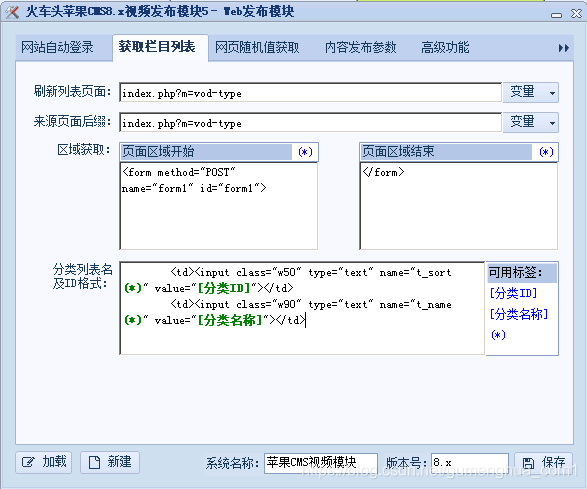 发表地址后缀:admin_interface.php?ac=vod 来源页面后缀:admin_interface.php?ac=vod 发布POST数据 表单名:pass 表单值:表单名:d_type 表单值:表单名:d_lang 表单值:表单名:d_level 表单值:表单名:d_area 表单值:表单名:d_class 表单值: 表单名:d_name 表单值:苹果cms火车头发布模块表单名:d_subname 表单值:表单名:d_enname 表单值:表单名:d_remarks 表单值:表单名:d_state 表单值:表单名:d_year 表单值:表单名:d_starring 表单值:表单名:d_directed 表单值:表单名:d_duration 表单值:表单名:d_tag 表单值:表单名:d_pic 表单值:表单名:d_scoreall 表单值:表单名:d_playfrom 表单值:表单名:d_playurl 表单值:表单名:d_content 表单值: 内容有点多啊,别弄错了,有些表单值需要根据自己的情况来添加发表错误标志:err 发布成功标志:ok和数据已保存 以上步骤操作完后填写系统名称和版本好进行保存并关闭