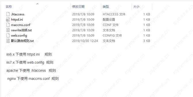2 小时前 上传 2,功能开启了还需要上传伪静态规则到我们的网站上,设置伪静态要根据自己环境使用对应的伪静态规则才可以使网站正常运行。下面是常见的几种环境所对应的伪静态规则。 ① iis6.x 下使用 httpd.ini 规则 ② iis7.x 下使用 web.config 规则 ③ apache 下使用 .htaccess 规则 ④ nginx 下使用 maccms.conf 规则 3,伪静态规则去哪里找呢?这个很多人都疏忽了,其实就在苹果cms系统安装包里自带,系统文件夹里面包含一个伪静态规则名称的文件夹,里面就是常见的几种环境的规则。
