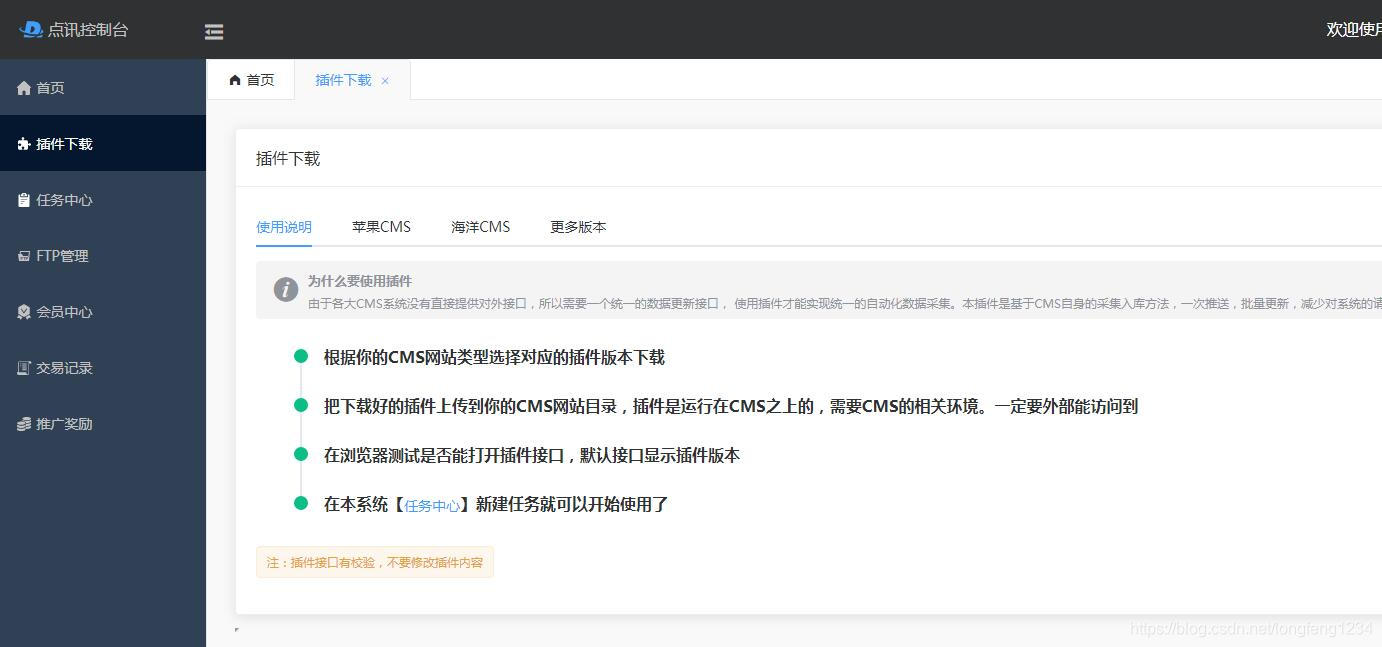 2、然后登陆点讯控制台(https://console.dxyun.cc),先进入【插件下载】下载CMS对应的插件,然后上传到你的CMS上,需要外网能访问到